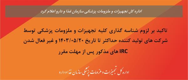 نظر به ضوابط اجرایی تبصره 4 ماده 18 قانون مبارزه با قاچاق کالا و ارز در خصوص الزام شناسه گذاری کلیه تجهیزات و ملزومات پزشکی وارداتی و تولیدی و پیرو خبر شماره 5174 مورخ 11/07/1401 در خصوص تاکید مکرر اداره کل تجهیزات و ملزومات پزشکی بر این امر و عدم شناسه گذاری توسط برخی از شرکت های تولیدی ضروری است که تا کلیه شرکت های تولید کننده مذکور در لیست پیوست، نسبت به شناسه گذاری کامل محصولات خود حداکثر تا تاریخ 20/05/1403 اقدام نمایند. لازم بذکر است در صورت عدم شناسه گذاری IRC های مذکور پس از مهلت مقرر ، IRC های مربوطه غیرفعال می گردد.