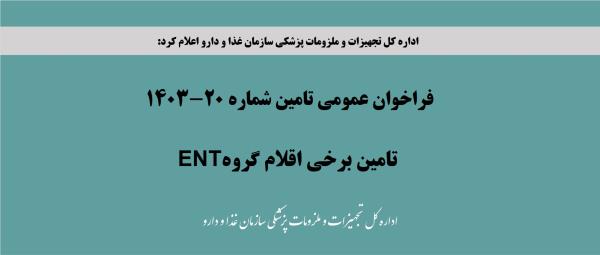 فراخوان عمومی تامین شماره 20-1403، تامین برخی اقلام گروه ENT مطابق پیوست 1 اداره نظارت بر تامین، توزیع و عرضه اداره کل تجهیزات و ملزومات پزشکی سازمان غذا و دارو طی اطلاعیه ای اعلام کرد: