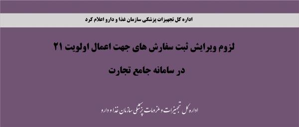 با توجه به اصلاح سیاست ارزی تجهیزات و ملزومات پزشکی از نرخ 4200 تومان به نرخ 28500 تومان و اعمال آن در سامانه TTAC، به اطلاع کلیه تامین کنندگان اقلام مذکور میرساند، به منظور تخصیص ارز نرخ 28500 تومان جهت ثبتسفارشات تامین ارز نشده، الزامیست در اسرع وقت نسبت به ویرایش ثبت سفارشات خود در سامانه جامع تجارت اقدام فرمایند.