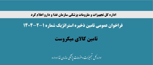 فراخوان عمومی تامین ذخیره استراتژیک شماره 1-2-1404، تامین میکروست مطابق مشخصات و تعداد (پیوست شماره 1) اداره کل تجهیزات و ملزومات پزشکی سازمان غذا و دارو طی اطلاعیه ای اعلام کرد: با توجه به ضرورت تامین 1.000.000 عدد مطابق مشخصات فنی و تعدادی اعلامی در (پیوست شماره 1) بمنظور ایجاد ذخیره استراتژیک در کشور با اولویت تامین از تولید کنندگان با کیفیت داخلی، از کلیه شرکت های دارای پروانه ساخت معتبر و فعال در این حوزه دعوت می گردد فرم تکمیل شده مشخصات (پیوست شماره 2)، اعلام قیمت و بازه زمانی قابل تحویل را تهیه و همراه با مدارک ذیل، در نسخه کاغذی ممهور به مهر و امضای معتبر شرکت، حداکثر تا پایان وقت اداری مورخ 1404/02/31 در پاکت در بسته، به همراه نامه و توسط نماینده شرکت به دبیرخانه محرمانه حراست سازمان غذا و دارو"ساختمان فخر رازی طبقه سوم" تحویل نمایند. جلسه توجیهی (سایت ویزیت) در تاریخ 1404/02/24 ساعت 14 در محل سالن جلسات اداره کل تجهیزات و ملزومات پزشکی برگزار خواهد گردید.